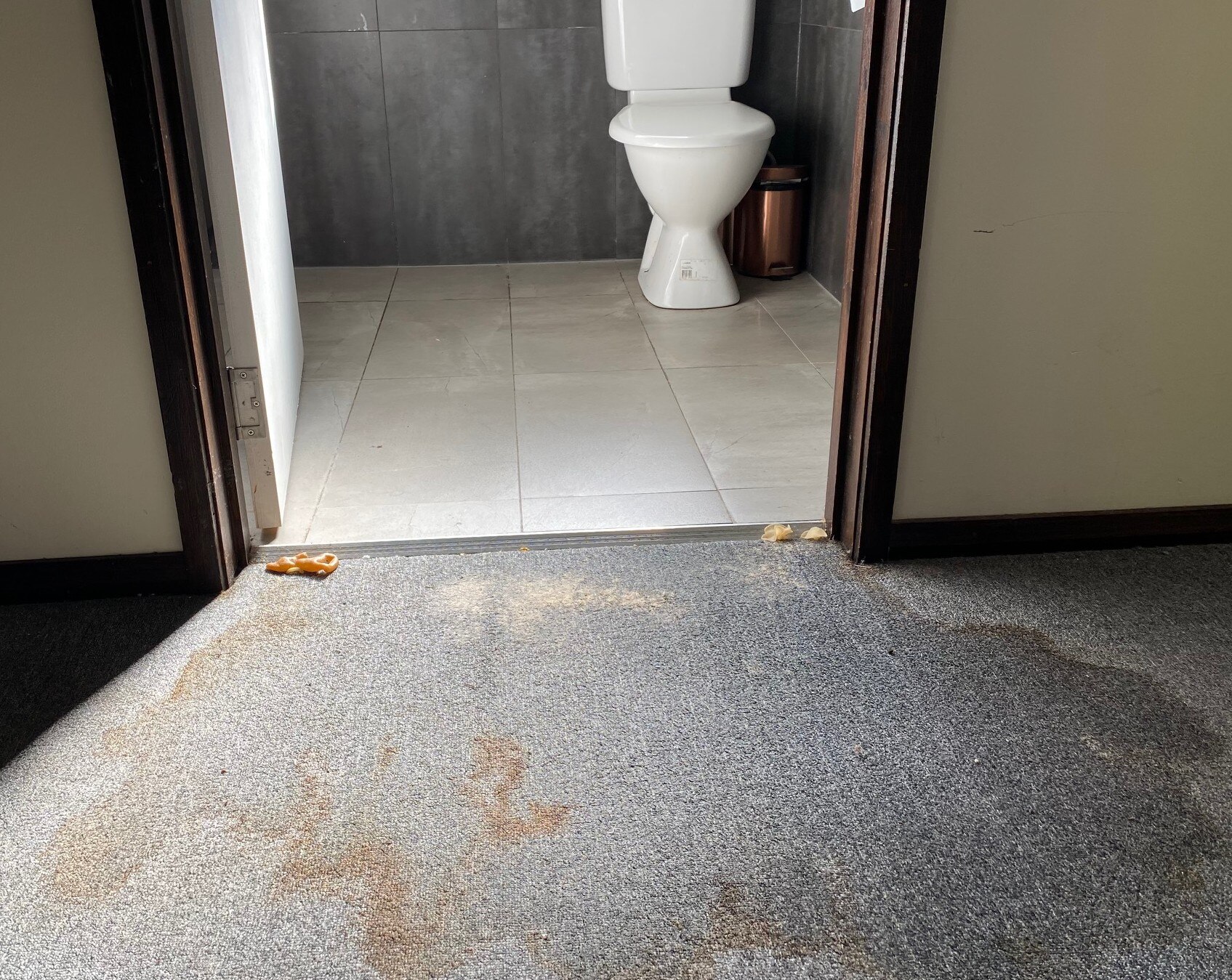 Weeks later, white and yellow mushrooms began sprouting from a stained area outside their bathroom.