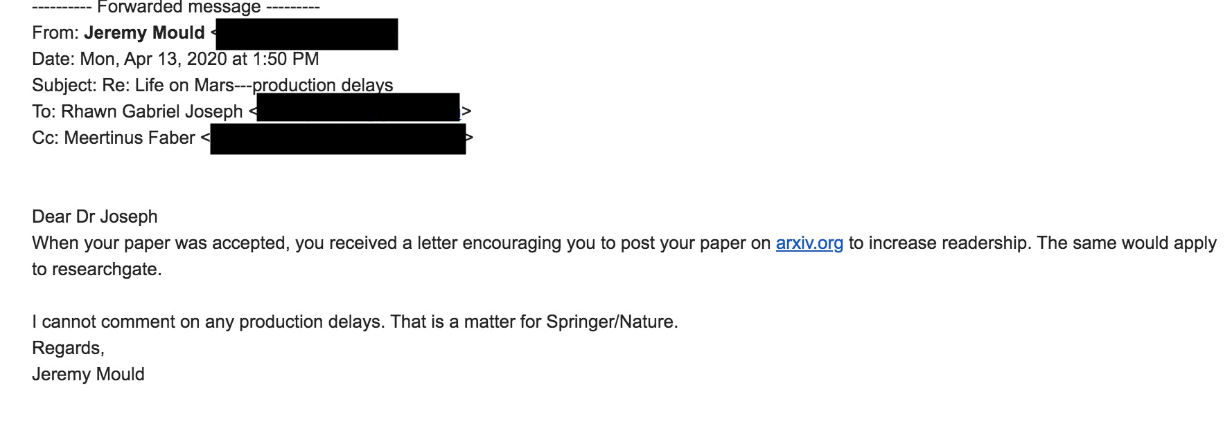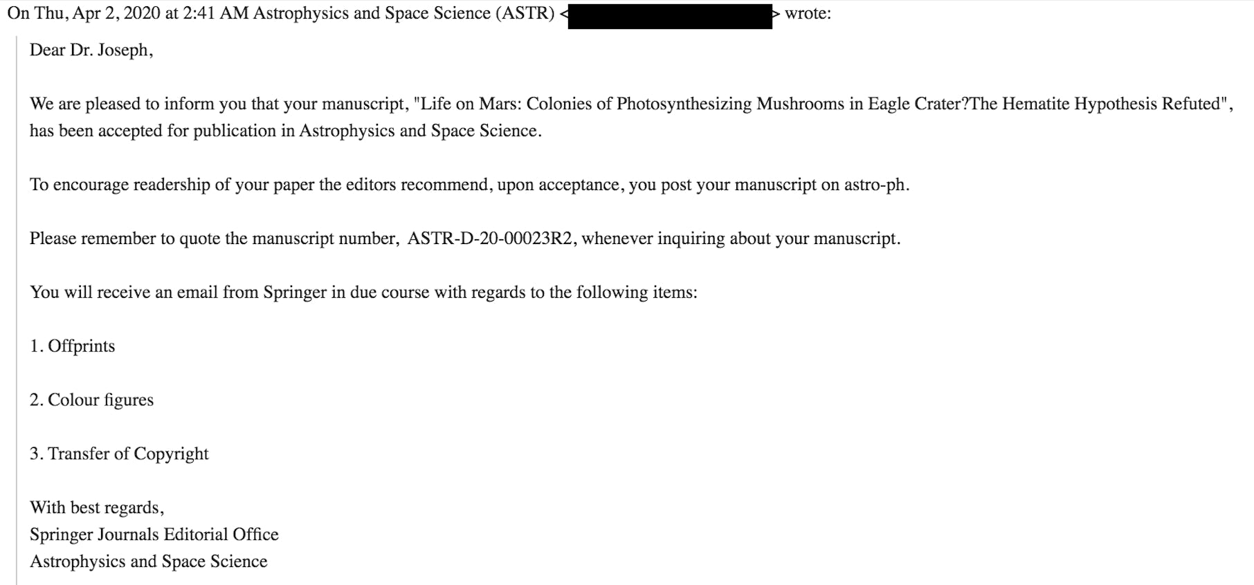 For Joseph, having his research published in a prestigious journal, like Astrophysics and Space Science, would mean the scientific community was finally taking his idea seriously. In many ways, it would be a big break for the scrutinized scientist and provide exactly the sort of legitimacy his idea had been lacking.
