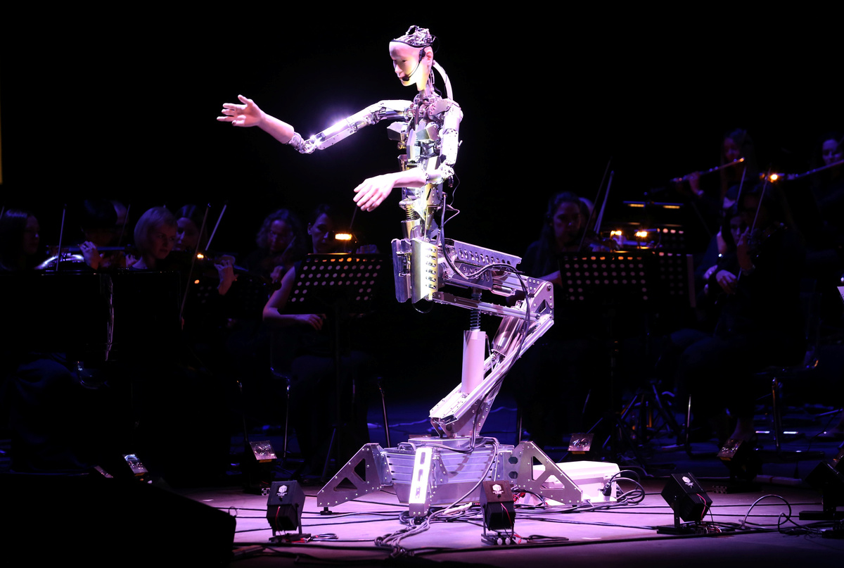 The conductor on the podium has no baton, no tailcoat and no musical score, but Android Alter 3 is kicking up a storm as it guides a symphony orchestra's players through their paces.