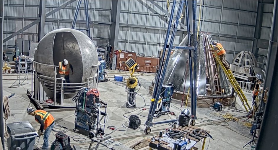 The image shows the vehicle’s oxygen tank and nose cone are well-underway — together they make up the forward-most part of the rocket.