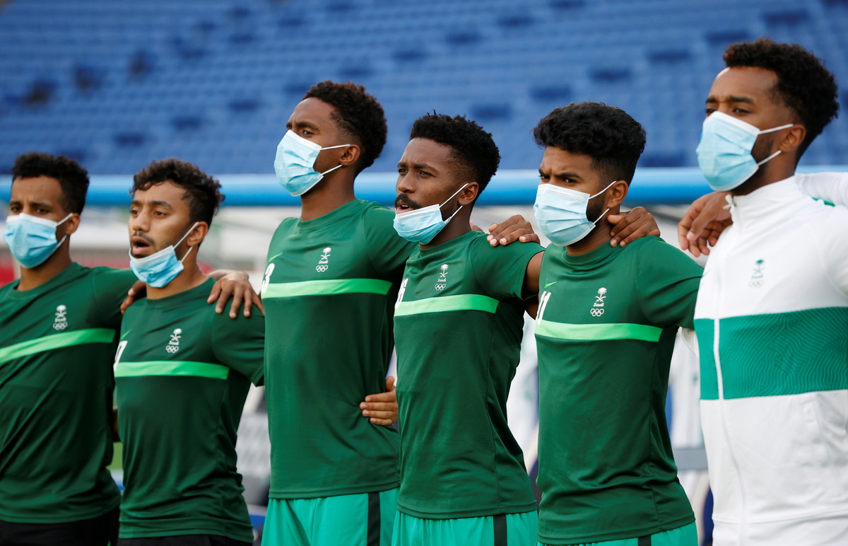 Some officials wearing Saudi-branded tracksuits appeared to be praying on a stone floor without the usual prayer mats. Their masks hiding smiles, Moroccan and Jordanian representatives shared sweets from small tins for the occasion.