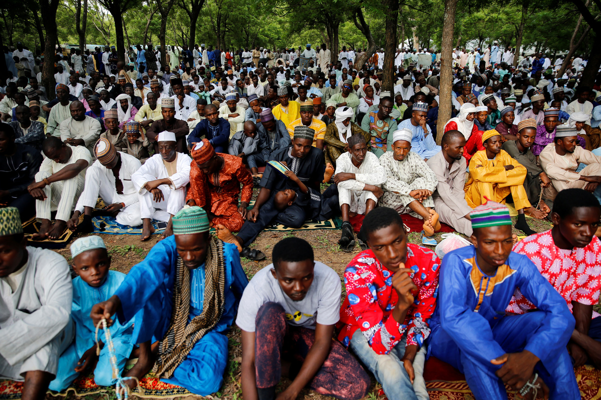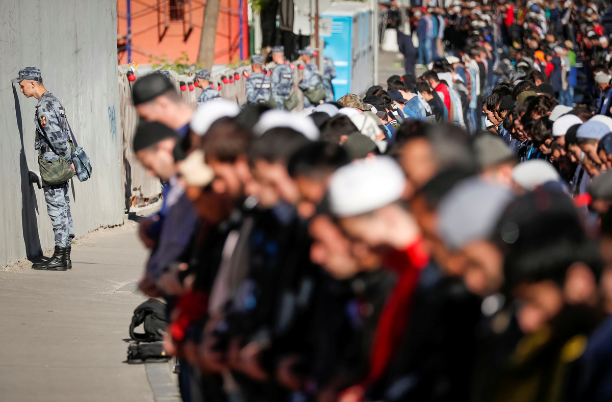 Members of Russia's National Guard line up as Muslims attend the morning prayers of Eid al-Fitr, marking the end of the holy month of Ramadan, in Moscow, Russia June 4, 2019. REUTERS/Shamil Zhumatov People take part in morning prayers to celebrate the first day of the Muslim holiday of Eid al-Fitr, marking the end of the holy month of Ramadan, in Kabul, Afghanistan June 4, 2019. REUTERS/Omar SobhaniMuslims attend the morning prayers of Eid al-Fitr, marking the end of the holy month of Ramadan, in Mogadishu, Somalia June 4, 2019. REUTERS/Feisal OmarMuslims attend the morning prayers of Eid al-Fitr, marking the end of the holy month of Ramadan, near the Moscow Cathedral Mosque, Russia June 4, 2019. REUTERS/Shamil ZhumatovMuslims attend the morning prayers of Eid al-Fitr, marking the end of the holy month of Ramadan, in Mogadishu, Somalia June 4, 2019. REUTERS/Feisal OmarMuslims celebrate Eid al-Fitr with mass prayers marking the end of Ramadan in Abuja, Nigeria June 4, 2019. REUTERS/Afolabi SotundeMuslims celebrate Eid al-Fitr with mass prayers marking the end of Ramadan in Abuja, Nigeria June 4, 2019 REUTERS/Afolabi Sotunde