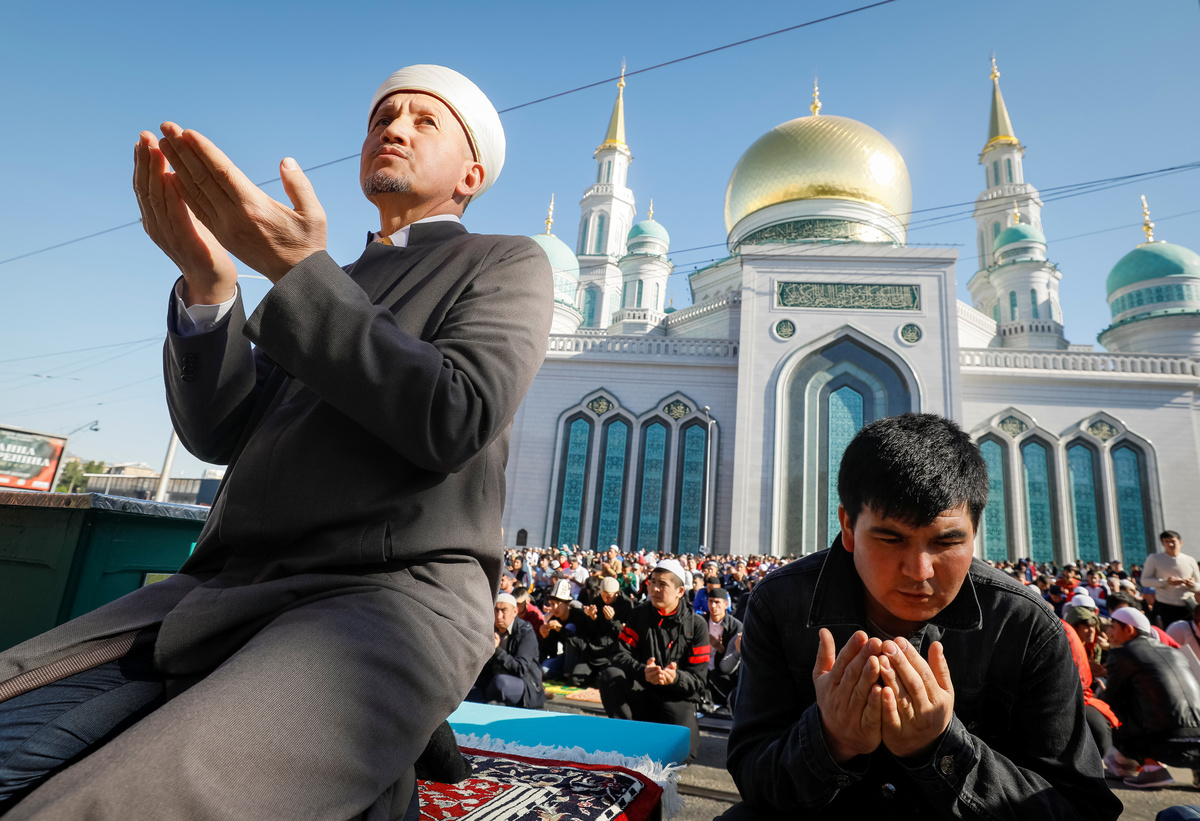 Muslims attend the morning prayers of Eid al-Fitr, marking the end of the holy month of Ramadan, near the Moscow Cathedral Mosque, Russia June 4, 2019. REUTERS/Shamil Zhumatov