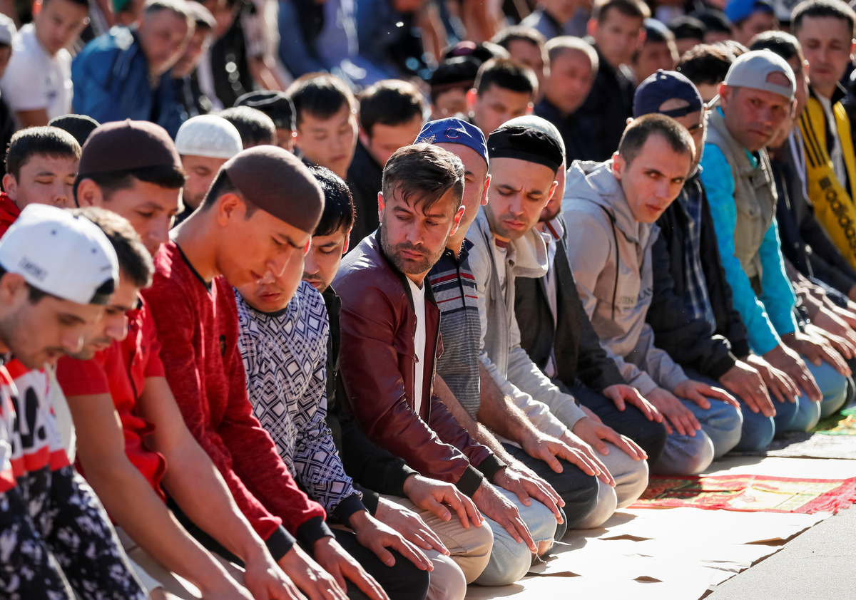 Muslims attend the morning prayers of Eid al-Fitr, marking the end of the holy month of Ramadan, in Moscow, Russia June 4, 2019. REUTERS/Shamil Zhumatov