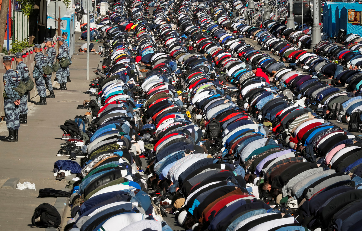Elsewhere, thousands of Muslims living in Moscow gathered in and outside the city's grand mosque to pray. Security was high and mounted police patrolled the streets.