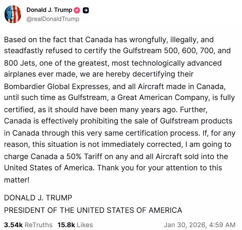 “If, for any reason, this situation is not immediately corrected, I am going to charge Canada a 50% Tariff on any and all Aircraft sold into the United States of America,” he wrote on social media platform Truth Social.