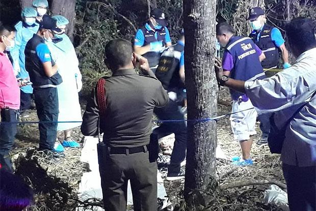 Police and forensic officers inspect body parts found at a forest reserve in Rayong on Jan 21. (Photos from Thevathuen Srisopha Facebook page)