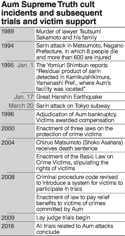 [All the trials related to the Aum attacks were concluded in January, with death sentences handed down for 13 perpetrators, including Shoko Asahara (real name: Chizuo Matsumoto, 63), who ordered the murder of lawyer Tsutsumi Sakamoto and his family and the sarin attacks in Matsumoto, Nagano Prefecture, and on the Tokyo subway. The future executions will be a focus of attention.]