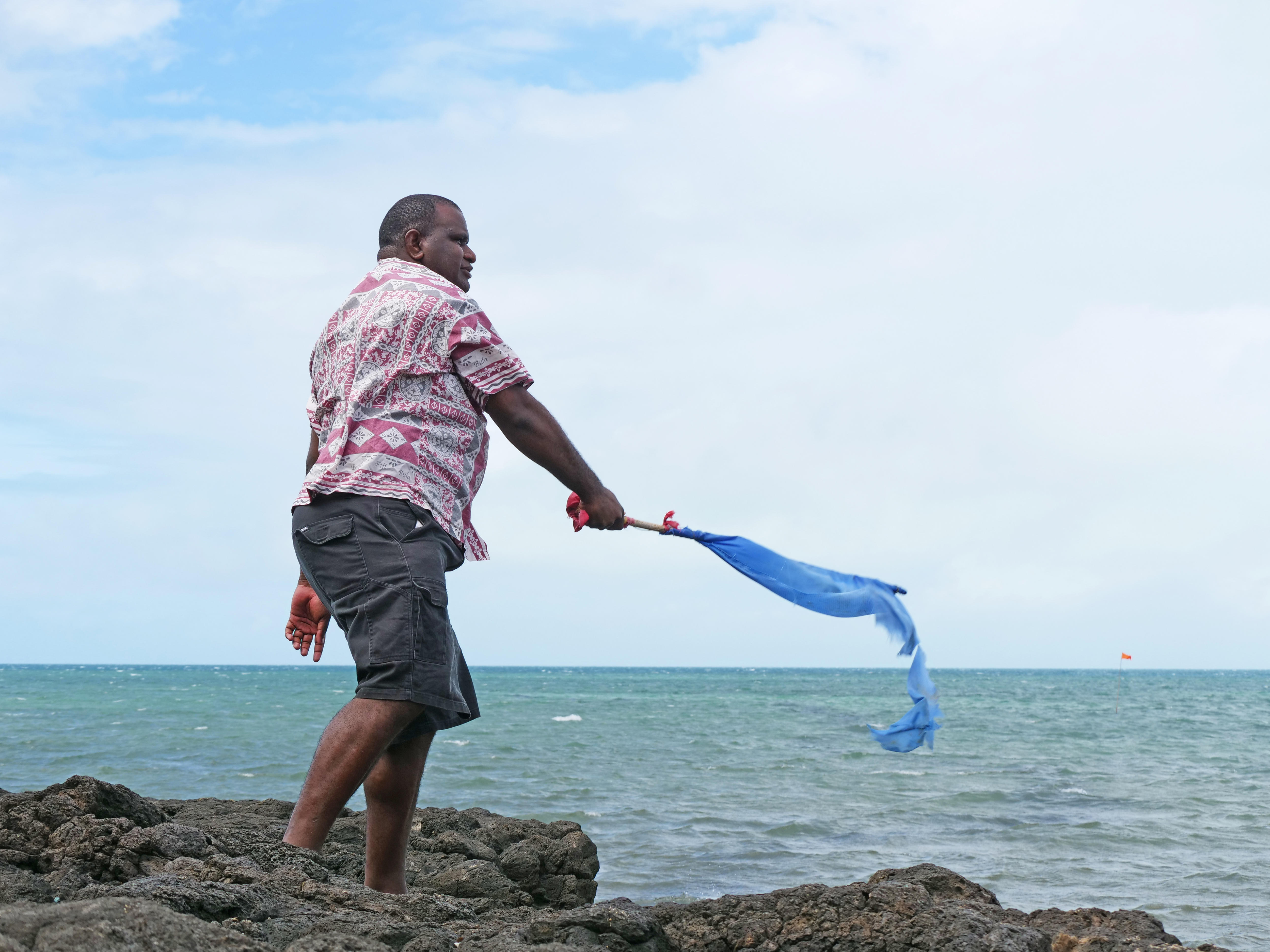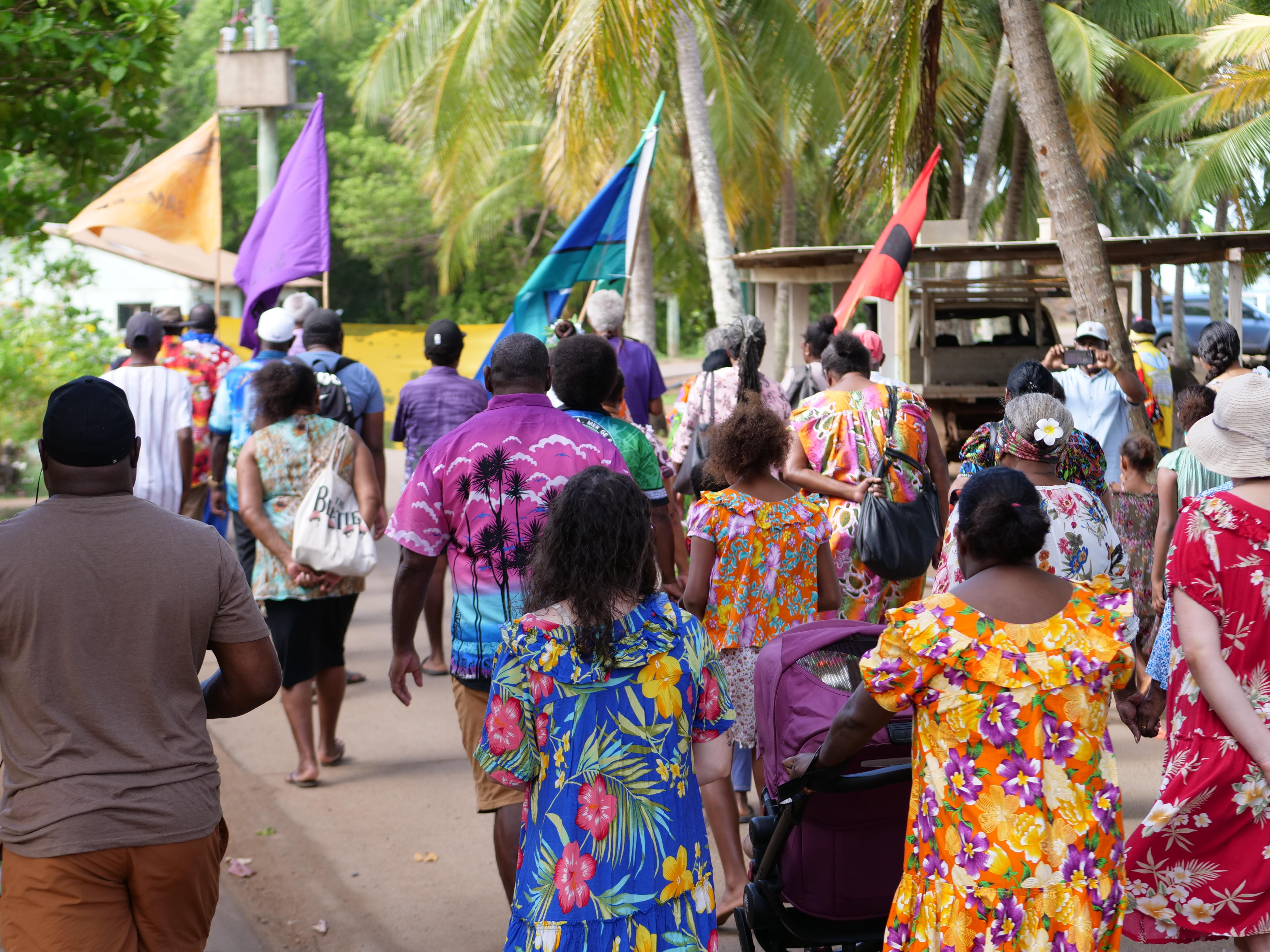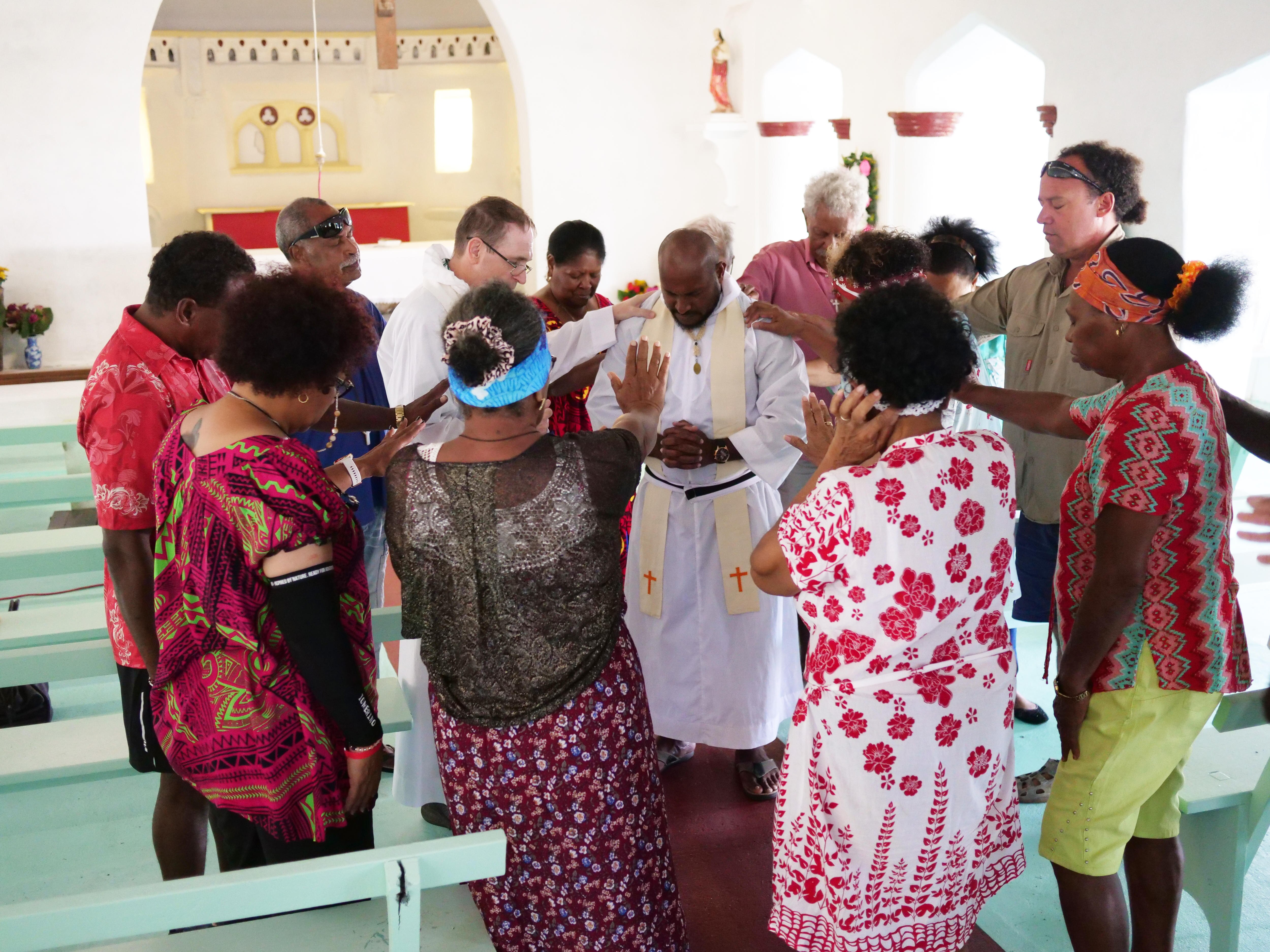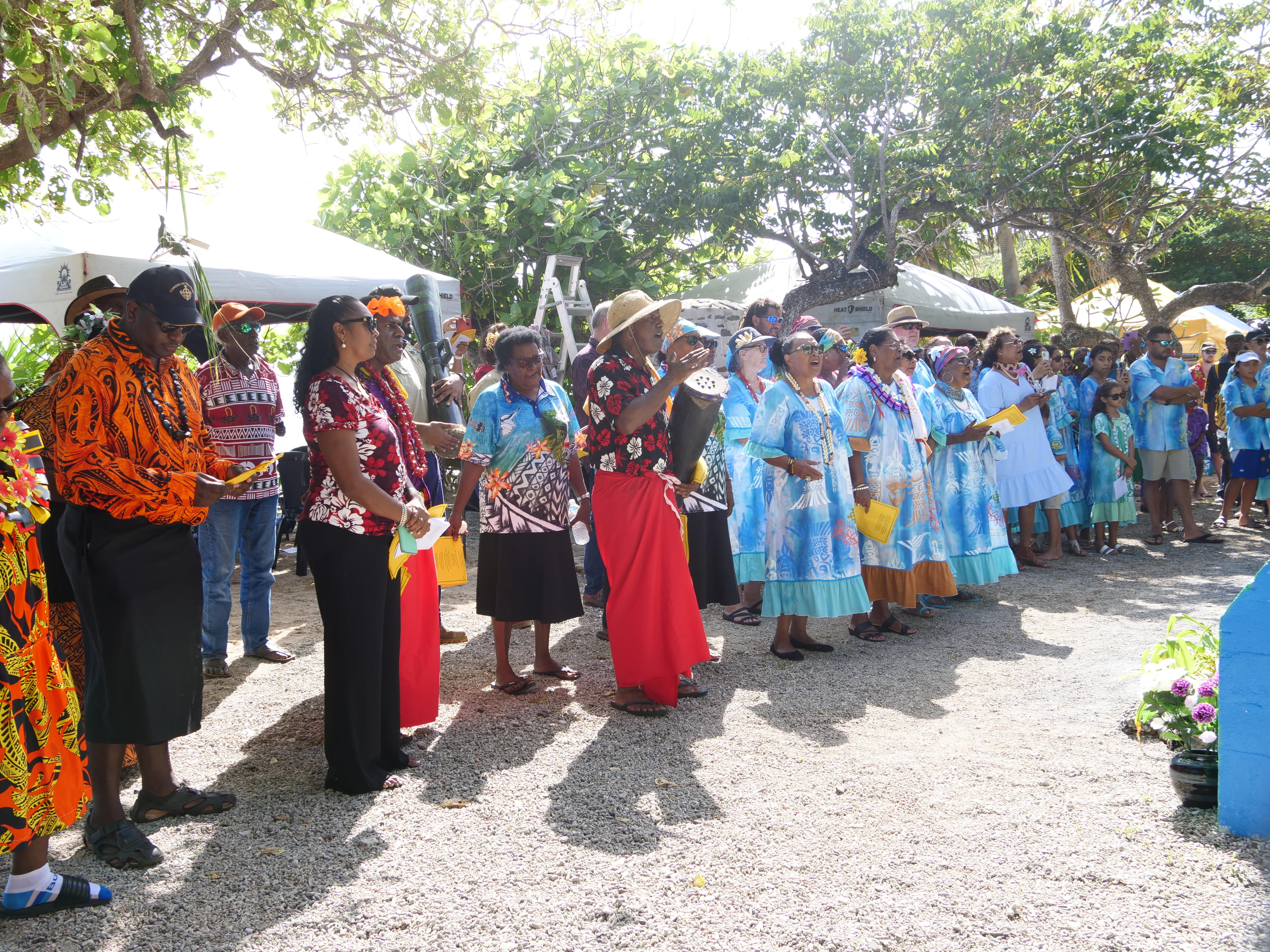 Locals gather near the jetty and after a warm welcome and island songs, Pastor Moa Sailor leads the crowd through the town blessing landmarks.