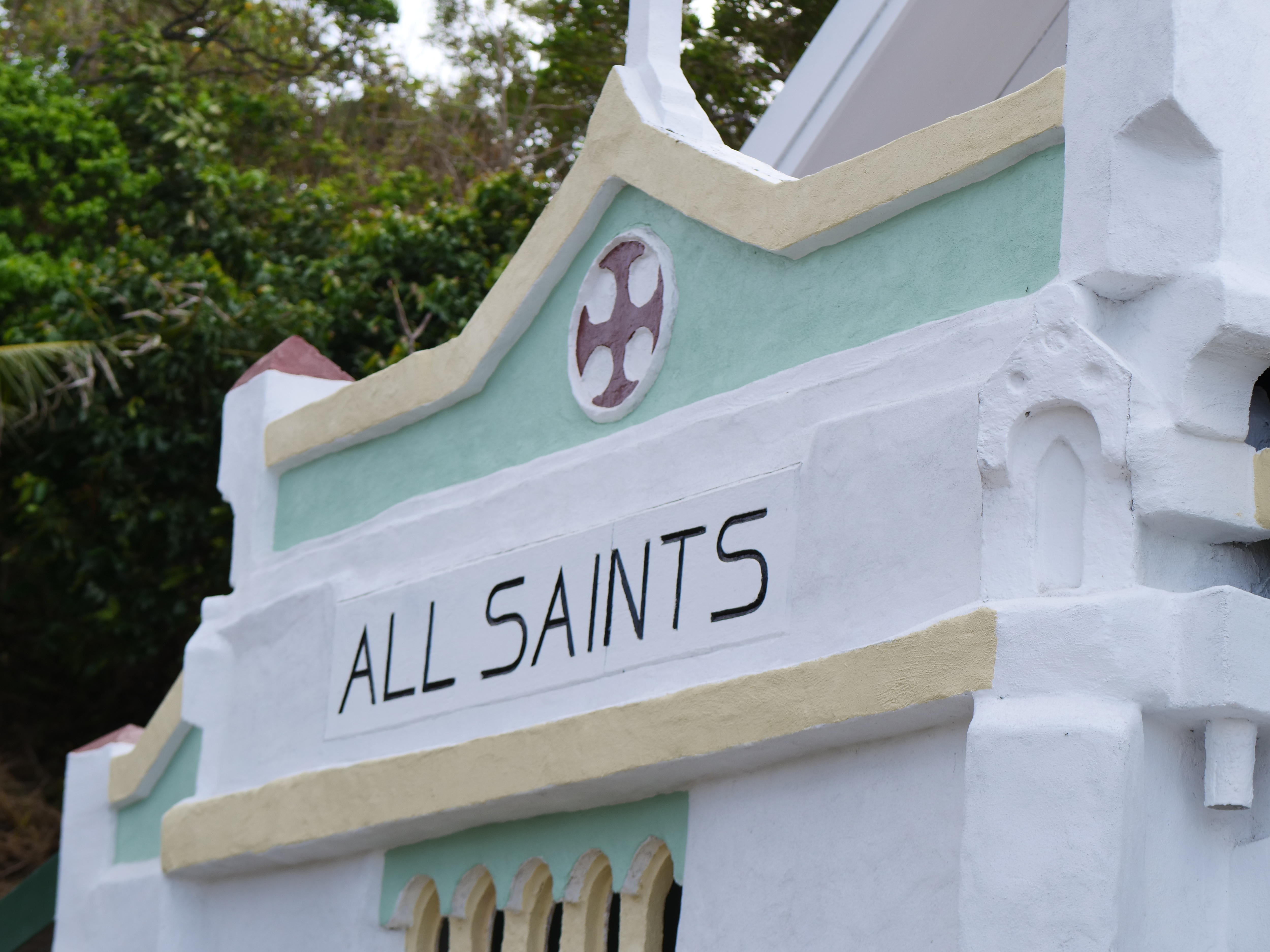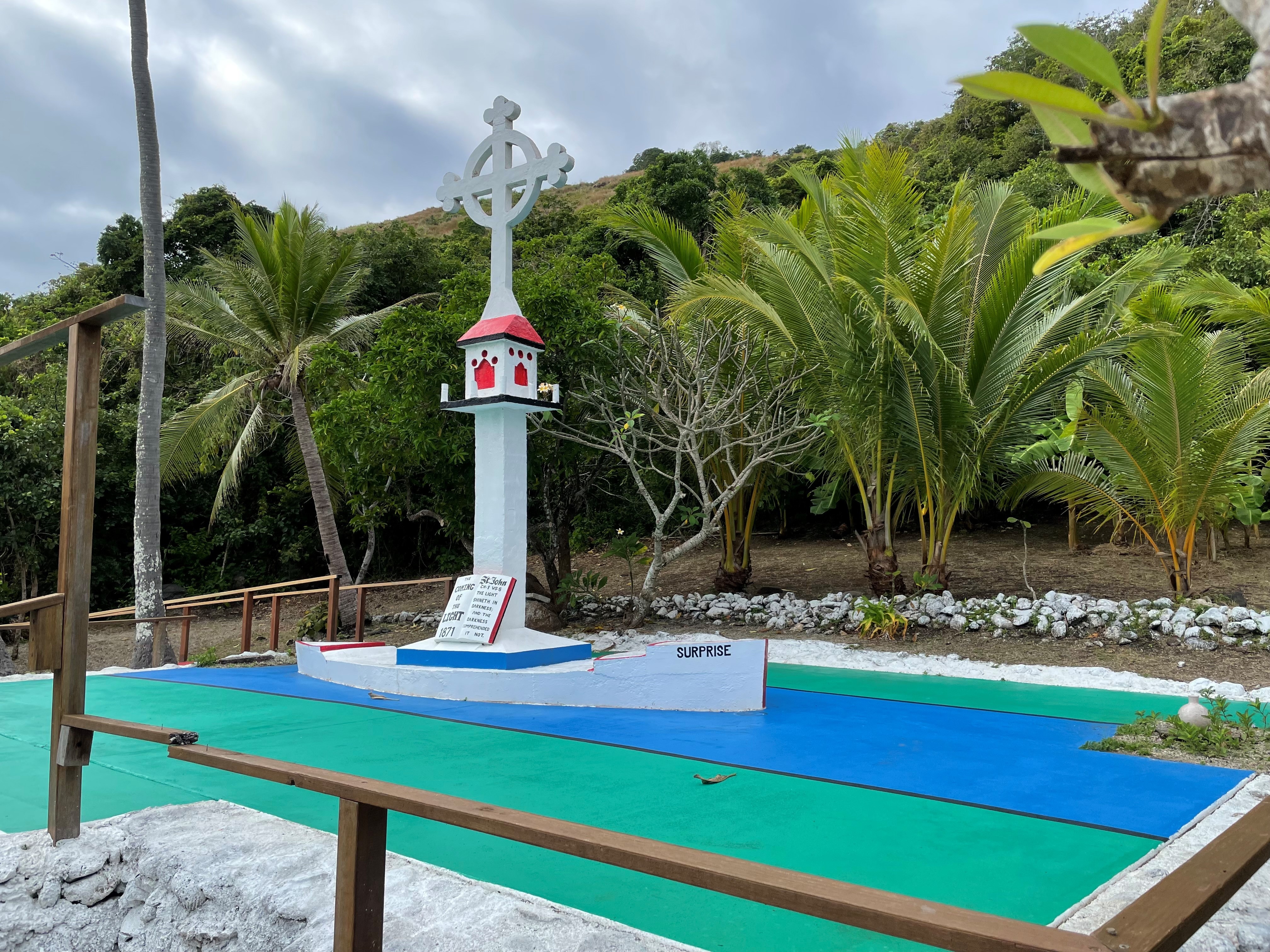 Several hundred people gather for a religious service that begins like any other, but the walls of the church have been replaced with coconut trees, broken coral beneath our feet and a view of Treacherous Bay.