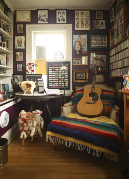 How he created it: Milner was living and teaching in St. Paul when he commissioned a woodworker to build a large full-wall storage cabinet to help him organize his vast collection of CDs. "I have a couple thousand, easily," he said, as well as a small library of music-related books. He stores his CDs mostly alphabetically, but some by genre and era. "Like the Buckinghams. If they were under 'B,' I would forget them, so I put them under '60s," he said. When he met his wife, Terry, and moved into her house in Minneapolis, the CD collection came with him. After her daughter grew up and moved out, Milner laid claim to her former bedroom and began creating his shrine. In addition to the CDs, he covered every wall with memorabilia, from album-cover art to framed autographs to offbeat keepsakes celebrating musicians both world-famous and obscure. There's a brush-with-fame snapshot of a room in Tobago where Beatles John Lennon, Ringo Starr and their wives once stayed. (Milner was at the same property, but staying in a different room.) On a more personal note is a framed card from Terre Roche of the singing sisters, the Roches. "Terre had one solo album. When I bought it, she sent a card, 'Dear Mark. Thanks for ordering my wreckerd. Terre.'?" One kooky treasure: a Christmas card Milner received from Tiny Tim in the 1990s and a framed "cheat sheet" for the chords from Tim's "Pizza Polka Rap," on which Milner played tuba. "It was his last recording," said Milner. "He was a sweetheart. A lovely man." Another quirky artifact: Milner's shorn ponytail, with its "birth" and "death" dates, in a display case. There also are a few nonmusical keepsakes, such as his father's World War II rifle and a grouping of sock monkeys. "One of them, my grandmother made for me. They're sentimental sock monkeys," he said. "I'm running out of space. I have more memorabilia than I've got walls."