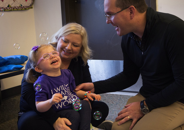 At a recent play session at the Kindering center in Bellevue, Hattie laughed as her nanny for the past eight months, Kena McClure, blew bubbles that drifted across her field of vision and popped gently on her face. Hattie is still unsteady when she tires. Sara sat on one side, holding her daughter's shoulder, while Troy held the other.