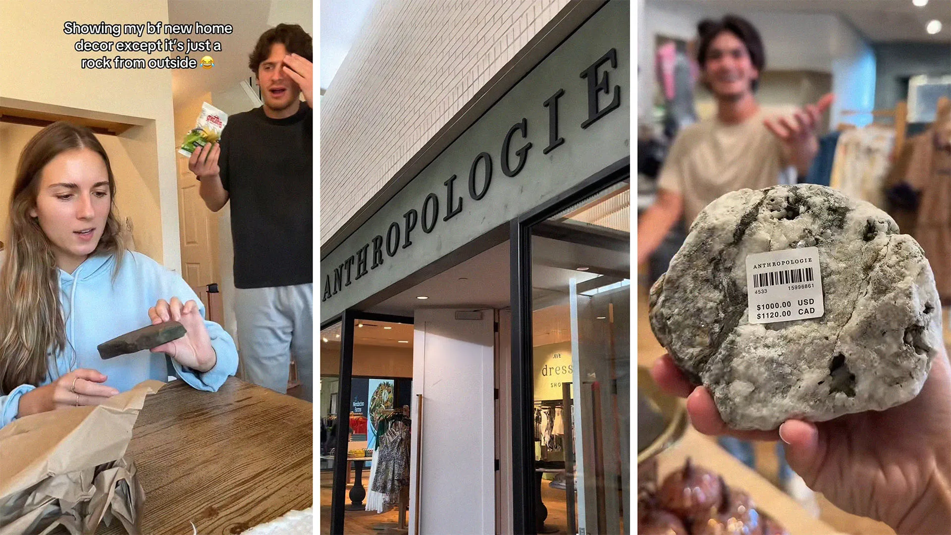 It all started earlier this month when TikToker Phoebe Adams (@phoebeadams112) pretended to receive a package from apparel and home store Anthropologie. In the clip, she “unboxes” the rock as her unsuspecting boyfriend, Dan, watches.