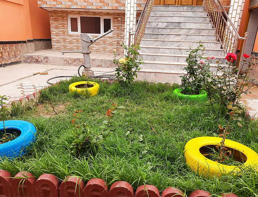 Look at this garden. We had a big garden. See! We painted those tyres ourselves.