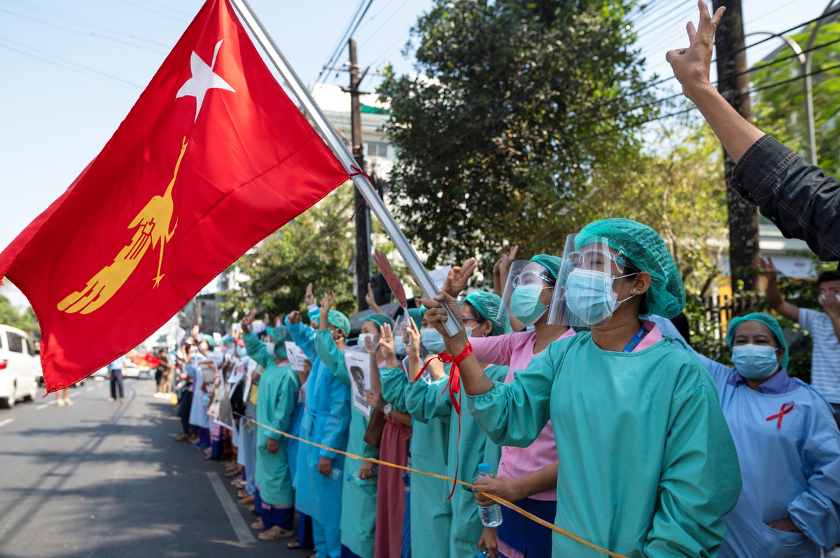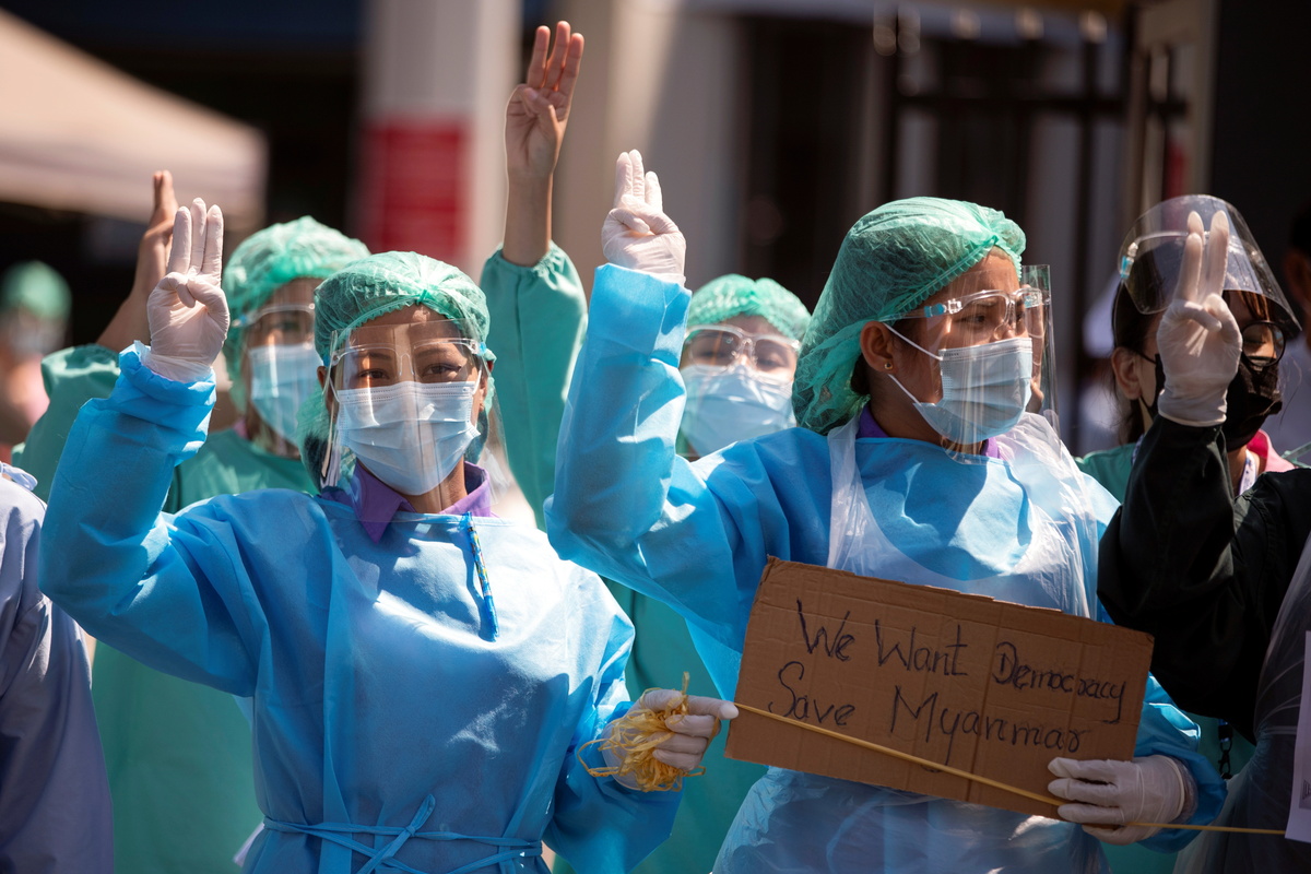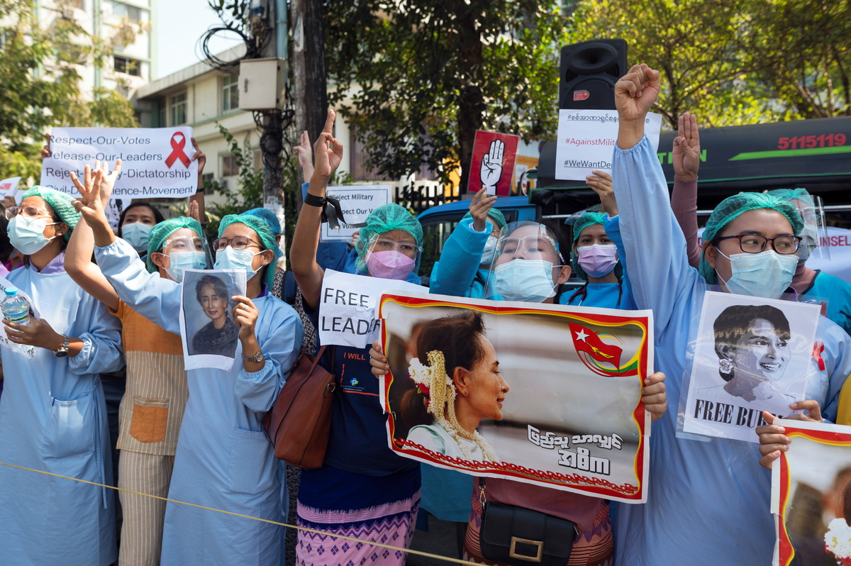 Thousands joined demonstrations in the main city of Yangon, while in the capital, Naypyitaw, hundreds of government workers marched in support of a growing civil disobedience campaign.