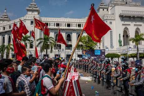 Crowds marched in the streets of Yangon, Myanmar's biggest city, on Sunday to protest against the coup, according to the Associated Press.