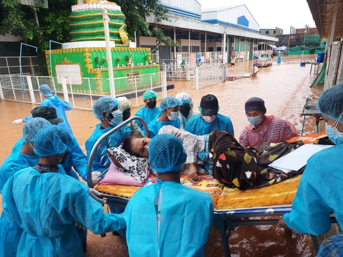 Volunteers and medical workers trundled bedridden patients, still hooked up to oxygen tanks, over murky flood waters in the Kayin town of Myawaddy, Facebook photographs posted by the Karen Information Center (KIC) media group showed.