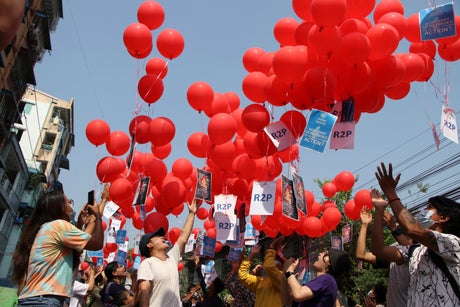 Protesters on Monday sent hundreds of red balloons into the air in Myanmar’s biggest city, Yangon in support of civilian leader Aung San Suu Kyi who was ousted in the coup and detained. Many also wore red shirts, the color of her National League for Democracy party.