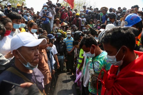 Myanmar recorded at least 38 deaths during the lethal charge by soldiers on Wednesday, the country’s worst day of violence, when Angel was shot in the head in Mandalay wearing the now-famous T-shirt. Protesters, including many youngsters, sang songs around her coffin, raised the three-fingered salute and chanted slogans.