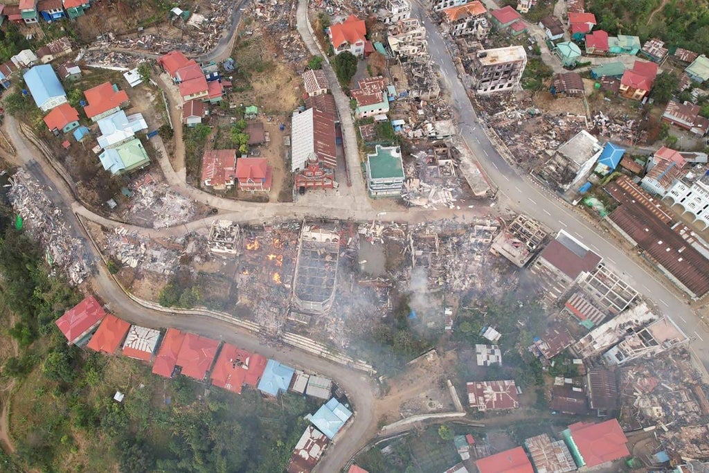 Thantlang, a town near the Indian border, has also been emptied of its people after four months of heavy fighting, according to the Chin Human Rights Organization. Drone footage shot by the group in October and December and seen by the AP shows fires raging inside buildings and charred churches, collapsed schools and ruined homes. The footage matches fires detected by satellites and interviews with villagers.