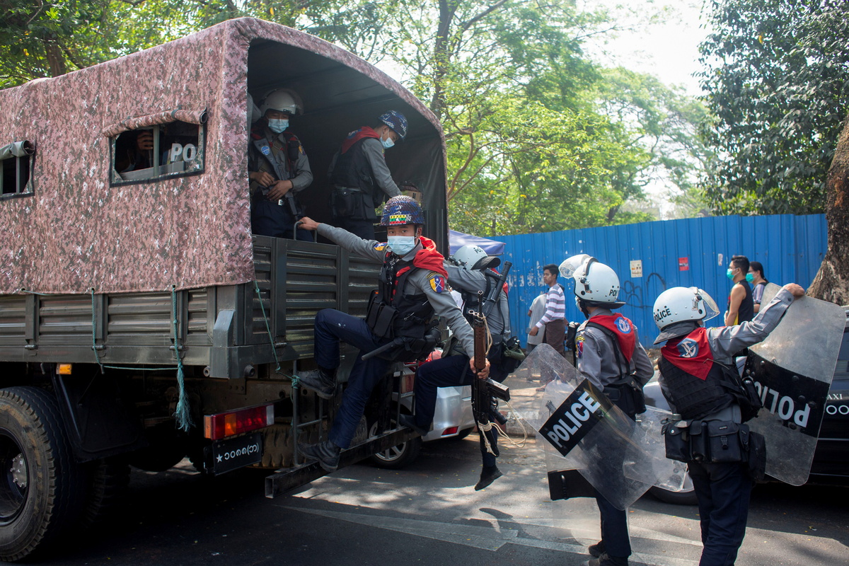 Police were out in force early on Saturday, taking up positions at usual protest sites in the main city of Yangon.