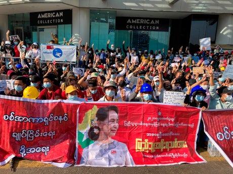 The protesters are demanding that power be restored to Suu Kyi’s deposed civilian government. They're also seeking freedom for her and other governing party members since the military detained them after blocking the new session of Parliament on Feb. 1.
