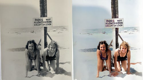 You can also colorize old photos using the service. Here’s a before-and-after of a 1932 photo of my great-grandma and her friend being goofy at the beach.