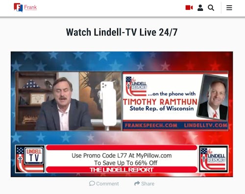 The first thing you’ll notice upon loading Frank Speech is that it does, indeed, look very much like a homemade, self-hosted website. Soon after, you’ll notice a livestream entitled simply “Lindell TV,” which is apparently available to watch all day, every day. It includes such content as Lindell yelling about voting machines (his one true passion) with various politicians and pundits.