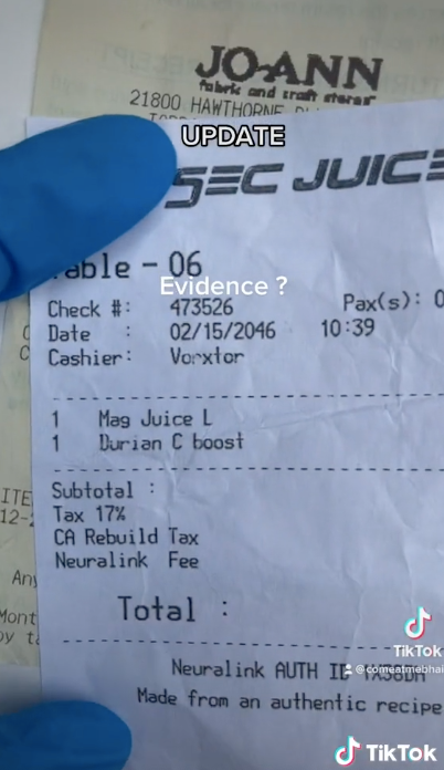 The second video on the account then claims to show ‘evidence’ and presents to the camera several receipts that have dates on them from the year 2046. One of the receipts makes reference to Neuralink, Elon Musk’s ‘brain chip’ start-up company.