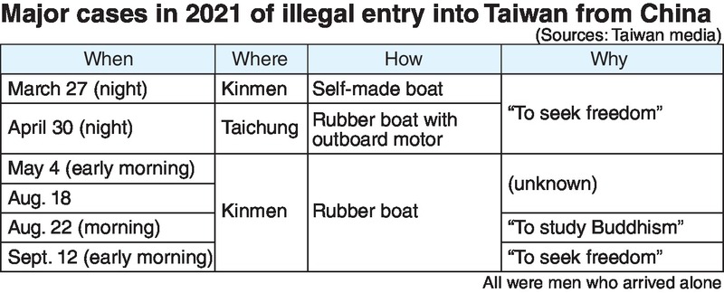 With unusual crossings increasing, the Taiwan High Prosecutors Office in August instructed district offices across Taiwan to quickly assess whether people who illegally entered had any connection to national security issues.