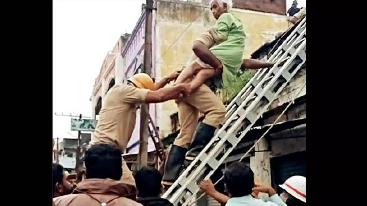Five persons -- Mahadev Rao, wife Nagaratna, children Akshay and Prithvi, and elderly woman Neelamma Bai, who were residing on the first floor on lease -- got trapped in the house. The occupants gingerly shifted to a seemingly safer room in the house. With the staircase leading to the first floor collapsed, the occupants trapped in the room were shifted to safety by the fire force personnel who dropped ladders and ropes from neighbouring buildings. They cut open the roof sheet to access the house.