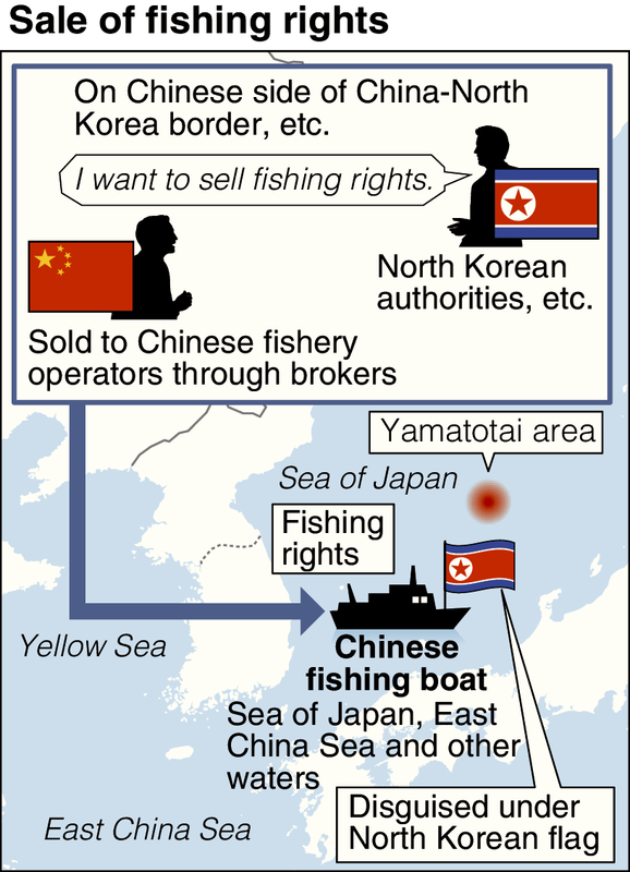Meanwhile, South Korea's National Intelligence Service reported to the legislature in 2016 that the North had sold fishing rights to about 1,500 Chinese fishing boats that year, a three-fold increase from the average year, adding that the country had earned about 30 million dollars, or about 3.2 billion yen, from the sales.
