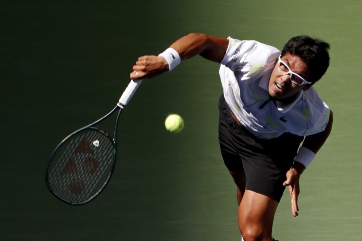 Aug 31, 2019; Flushing, NY, USA; Hyeon Chung of Korea serves against Rafael Nadal of Spain (not pictured) in the third round on day six of the 2019 U.S. Open tennis tournament at USTA Billie Jean King National Tennis Center. Mandatory Credit: Geoff Burke-USA TODAY Sports