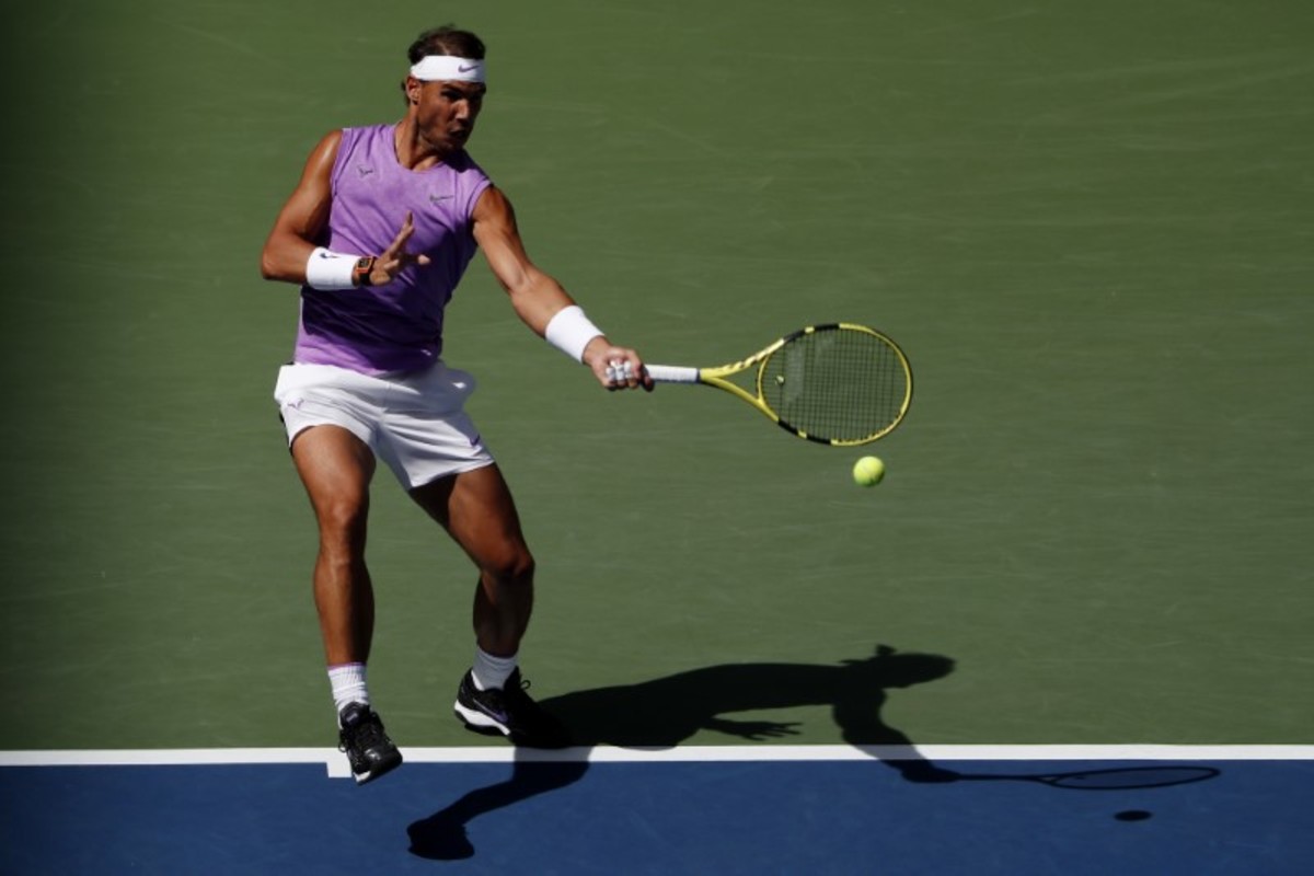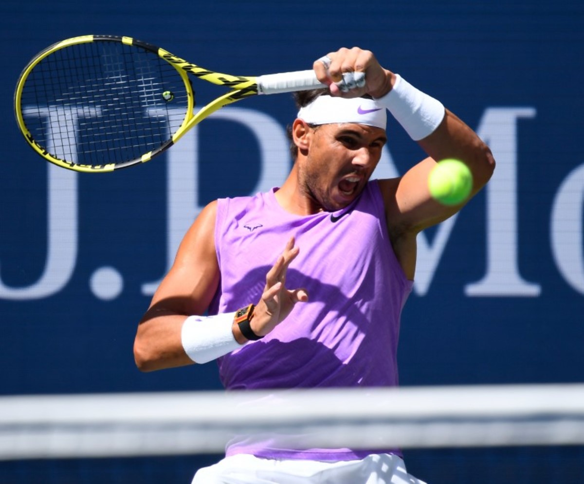Aug 31, 2019; Flushing, NY, USA; Rafael Nadal of Spain hits a forehand against Hyeon Chung of Korea (not pictured) in the third round on day six of the 2019 U.S. Open tennis tournament at USTA Billie Jean King National Tennis Center. Mandatory Credit: Geoff Burke-USA TODAY Sports