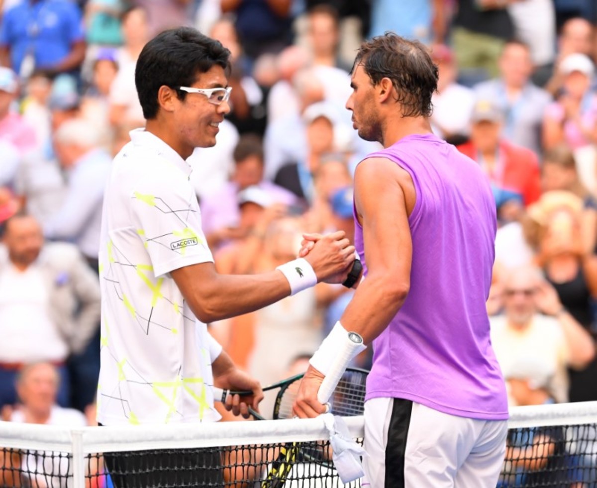 Hyeon Chung of Korea hits to Rafael Nadal of Spain in the third round on day six of the 2019 U.S. Open tennis tournament at USTA Billie Jean King National Tennis Center. Mandatory Credit: Robert Deutsch-USA TODAY SportsAug 31, 2019; Flushing, NY, USA; Rafael Nadal of Spain hits a forehand against Hyeon Chung of Korea (not pictured) in the third round on day six of the 2019 U.S. Open tennis tournament at USTA Billie Jean King National Tennis Center. Mandatory Credit: Geoff Burke-USA TODAY SportsAug 31, 2019; Flushing, NY, USA; Rafael Nadal of Spain (right) greets Hyeon Chung of Korea after the third round on day six of the 2019 U.S. Open tennis tournament at USTA Billie Jean King National Tennis Center. Mandatory Credit: Robert Deutsch-USA TODAY SportsAug 31, 2019; Flushing, NY, USA; Rafael Nadal of Spain after beating Hyeon Chung of Korea in the third round on day six of the 2019 U.S. Open tennis tournament at USTA Billie Jean King National Tennis Center. Mandatory Credit: Robert Deutsch-USA TODAY Sports