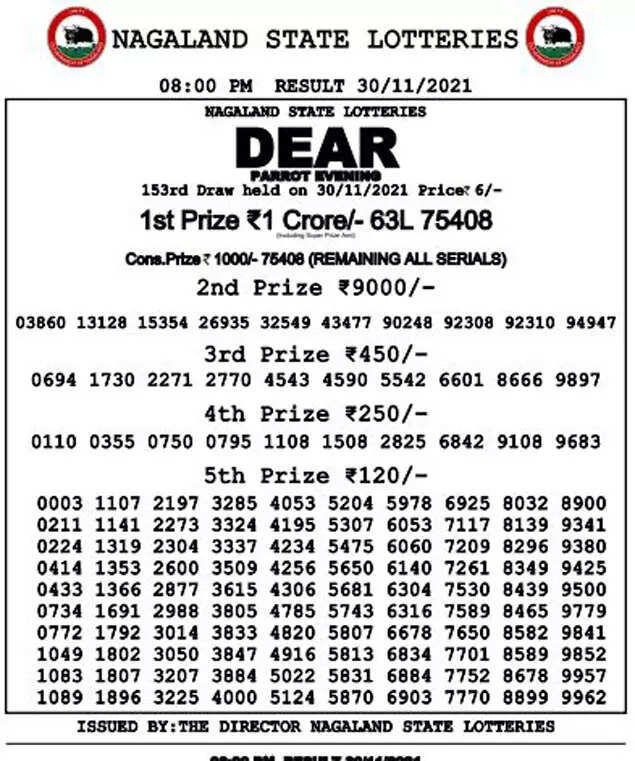The lottery results will be declared at 8pm. You can check the Nagaland State Lotteries November 30 results below. Result of the December 1 draw once declared will be available on its official website.