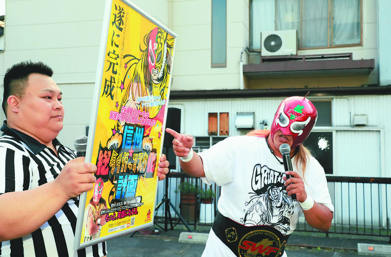 The group, led by a 46-year-old wrestler who goes by the name Great Mucha, aims to lift the spirits of the prefecture's residents. After graduating from a university in Tokyo, he worked at a foreign life insurance firm, among other jobs. When Great Mucha returned to his hometown of Ueda, Nagano Prefecture, he found the town to be lacking energy. Hoping to revitalize his hometown while utilizing his experience as an amateur wrestler from his university days, Great Mucha founded the Shinshu Prowrestling Federation in 2007.