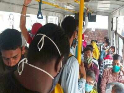 State government directives clearly say that public transport can operate with 100% capacity but without standing, but TOI spotted many overcrowded buses with passengers standing in them.