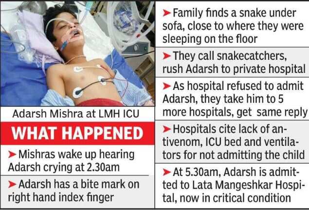 Adarsh (10) was admitted in a critical state to Lata Mangeshkar Hosptial (LMH) at Hingna, about 41km from his home, after six hospitals — starting from the closest to his home — allegedly refused to treat him. Lack of snake antivenom, ventilator, and ICU bed were the excuses given to the Mishra family.