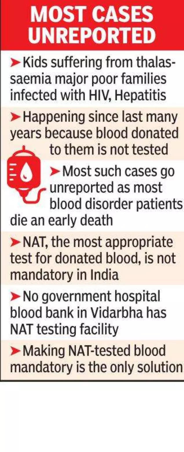 The NAT facility is available only in three private blood banks in Nagpur. No blood bank attached to any government hospital in Vidarbha has this facility. Most thalassaemia patients come from poor family backgrounds and are dependent on free blood supply from the government blood banks. So, they are always at risk.