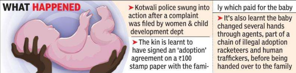 The Kotwali police had swung into action after a complaint was filed by the women and child development department on Wednesday evening. The rape survivor’s kin learnt to have signed an ‘adoption’ agreement on a Rs100 stamp paper with the family which paid for the baby. It’s learnt the baby changed several hands through agents, part of a chain of illegal adoption racketeers and human traffickers, before being handed over to the family which made the payment.