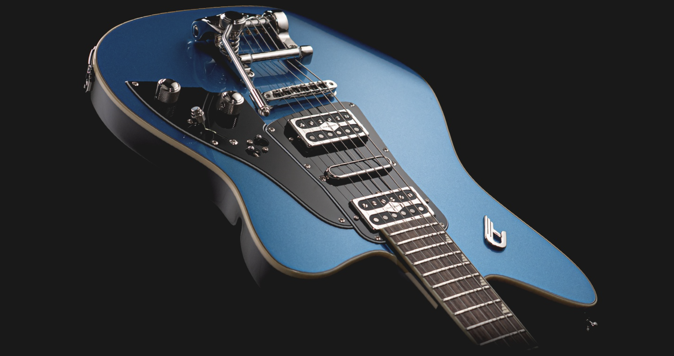 Based upon the firm’s Paloma Custom solidbody, there’s an alder body (with comfort carves) and an HSH pickup configuration that uses Duesenberg’s own units, with two Split/King Duo-Coils and a Pearlito single coil.