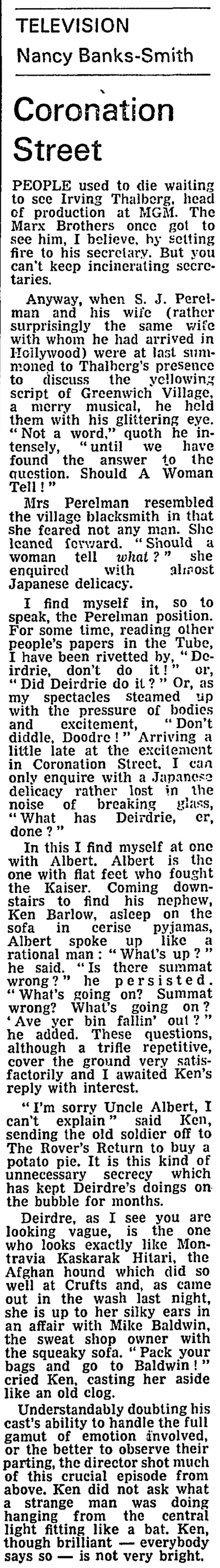 For 40 years while reviewing TV I couldn’t spell Deirdre. Was the “i” before the “e” or neither or either? Did the “er” come before the “re” or was it widdershins? For 40 flipping years I had to look Deirdre up, and Deirdre cropped up a lot. When 24 million people watch her wedding, you had better get the name of the bride right.