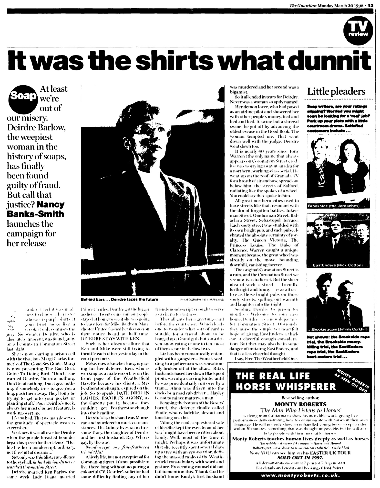 On Deirdre’s trial for fraud at the hands of ex-boyfriend Jon Lindsay that led to to a campaign to “free the Wetherfield One”, 30 March, 1998