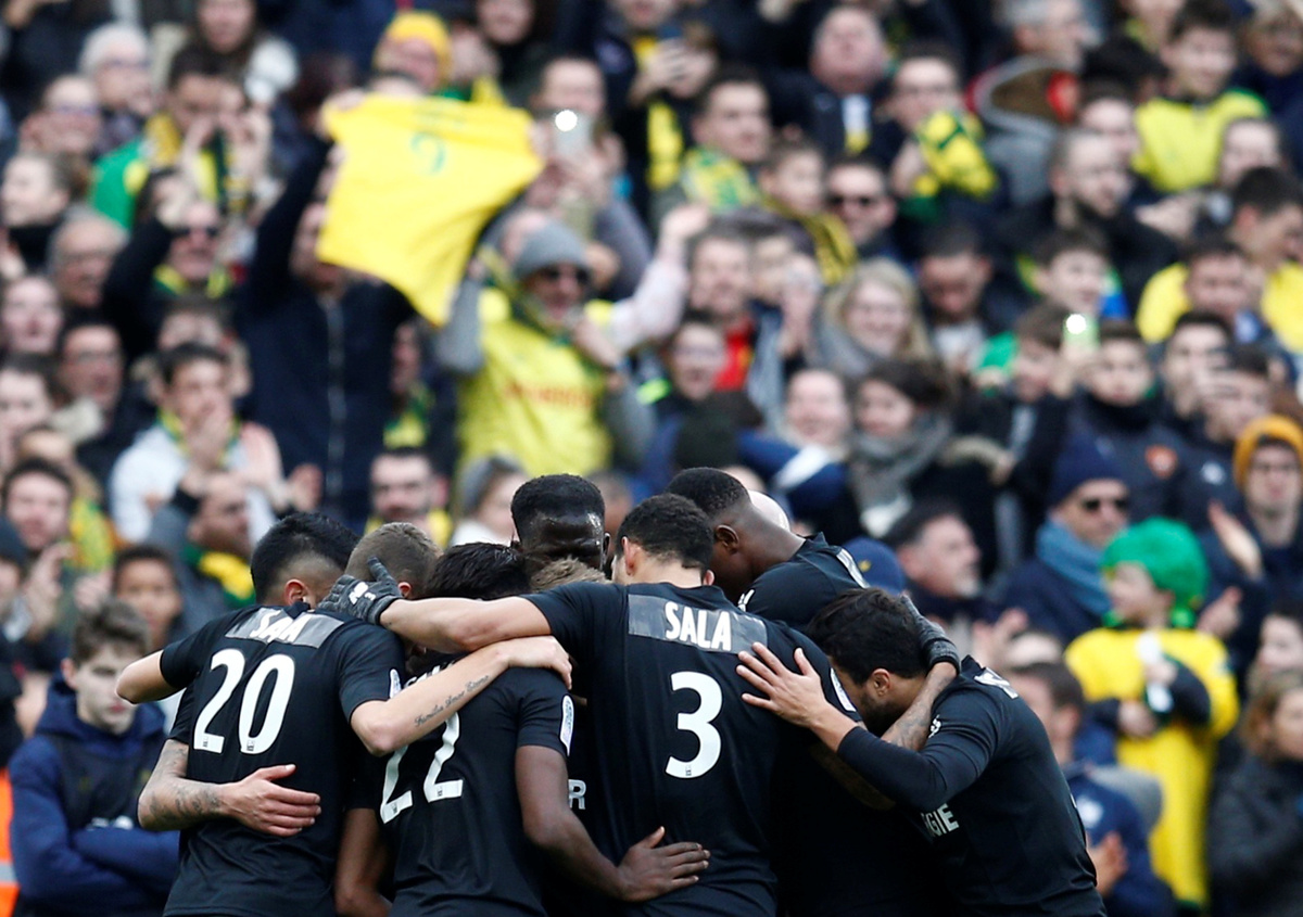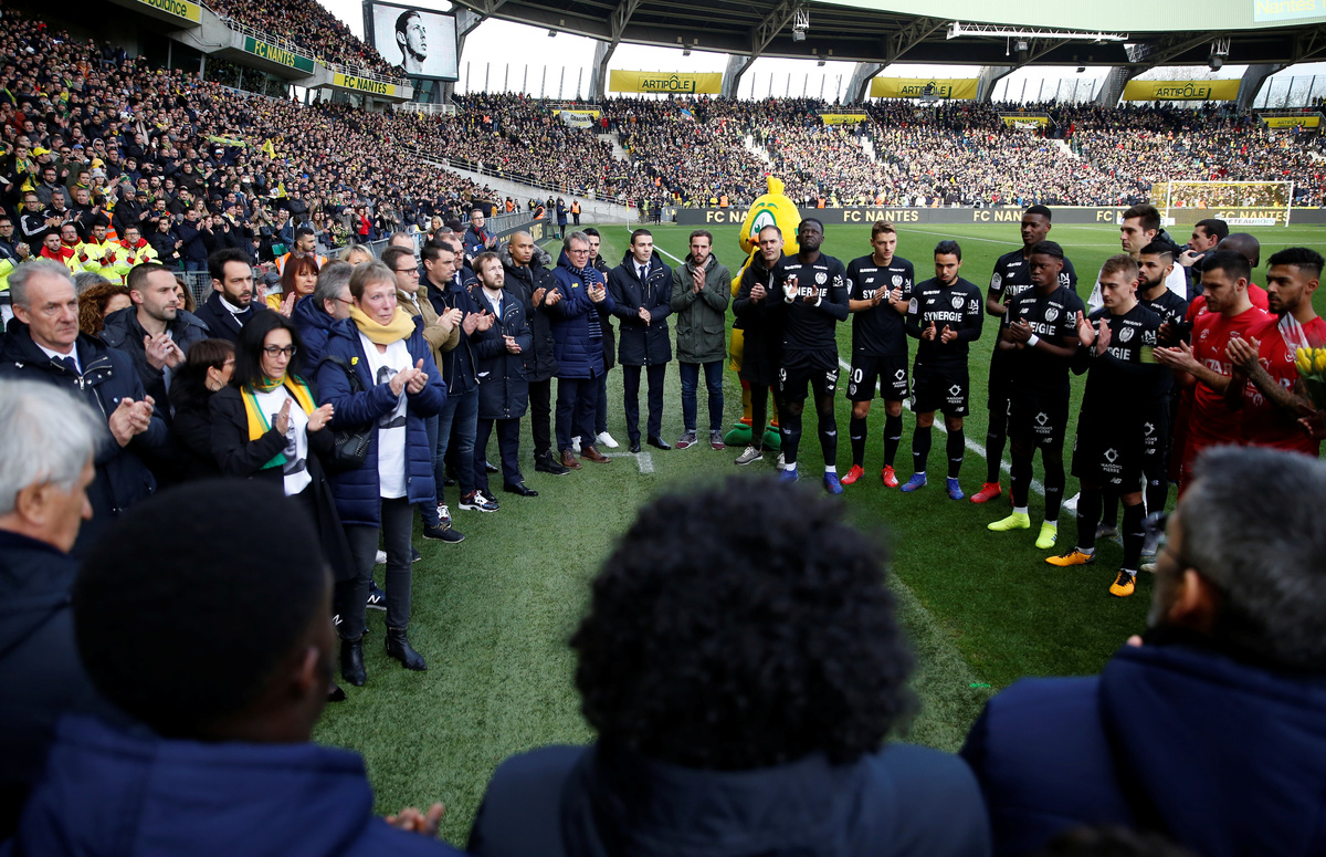 Soccer Football - Ligue 1 - FC Nantes v Nimes Olympique - The Stade de la Beaujoire - Louis Fonteneau, Nantes, France - February 10, 2019 FC Nantes and Nimes Olympique players applaud as a tribute in memory of Emiliano Sala REUTERS/Stephane MaheSoccer Football - Ligue 1 - FC Nantes v Nimes Olympique - The Stade de la Beaujoire - Louis Fonteneau, Nantes, France - February 10, 2019 A fan holds a shirt in memory of Emiliano Sala inside the stadium REUTERS/Stephane MaheSoccer Football - Ligue 1 - FC Nantes v Nimes Olympique - The Stade de la Beaujoire - Louis Fonteneau, Nantes, France - February 10, 2019 Fans hold a banner as a tribute in memory of Emiliano Sala inside the stadium REUTERS/Stephane MaheSoccer Football - Ligue 1 - FC Nantes v Nimes Olympique - The Stade de la Beaujoire - Louis Fonteneau, Nantes, France - February 10, 2019 FC Nantes players form a huddle REUTERS/Stephane MaheSoccer Football - Ligue 1 - FC Nantes v Nimes Olympique - The Stade de la Beaujoire - Louis Fonteneau, Nantes, France - February 10, 2019 FC Nantes players replace the names on their shirts in memory of Emiliano Sala REUTERS/Stephane MaheSoccer Football - Ligue 1 - FC Nantes v Nimes Olympique - The Stade de la Beaujoire - Louis Fonteneau, Nantes, France - February 10, 2019 General view of a tribute on the big screen inside the stadium in memory of Emiliano Sala REUTERS/Stephane MaheSoccer Football - Ligue 1 - FC Nantes v Nimes Olympique - The Stade de la Beaujoire - Louis Fonteneau, Nantes, France - February 10, 2019 FC Nantes' Nicolas Pallois in action with Nimes' Baptiste Guillaume REUTERS/Stephane MaheSoccer Football - Ligue 1 - FC Nantes v Nimes Olympique - The Stade de la Beaujoire - Louis Fonteneau, Nantes, France - February 10, 2019 FC Nantes' Kalifa Coulibaly celebrates scoring their first goal with Lucas Lima REUTERS/Stephane MaheSoccer Football - Ligue 1 - FC Nantes v Nimes Olympique - The Stade de la Beaujoire - Louis Fonteneau, Nantes, France - February 10, 2019 Nimes' Antonin Bobichon celebrates scoring their second goal with team mates REUTERS/Stephane MaheSoccer Football - Ligue 1 - FC Nantes v Nimes Olympique - The Stade de la Beaujoire - Louis Fonteneau, Nantes, France - February 10, 2019 Nimes' Jordan Ferri celebrates scoring their third goal REUTERS/Stephane MaheSoccer Football - Ligue 1 - FC Nantes v Nimes Olympique - The Stade de la Beaujoire - Louis Fonteneau, Nantes, France - February 10, 2019 FC Nantes' Ciprian Tatarusanu applauds fans after the match REUTERS/Stephane Mahe