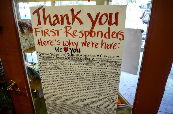 Nearly every business is open in the town plazas, and you see "thank you, first responders" signs on facades and shop windows. Many businesses invite customers to contribute to a local charity.