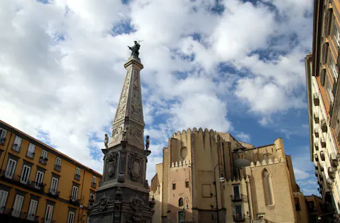 A poignant reminder of death stands in Naples, where the old Roman road meets the main college street and the imposing palazzos step back to reveal a sun-drenched plaza.