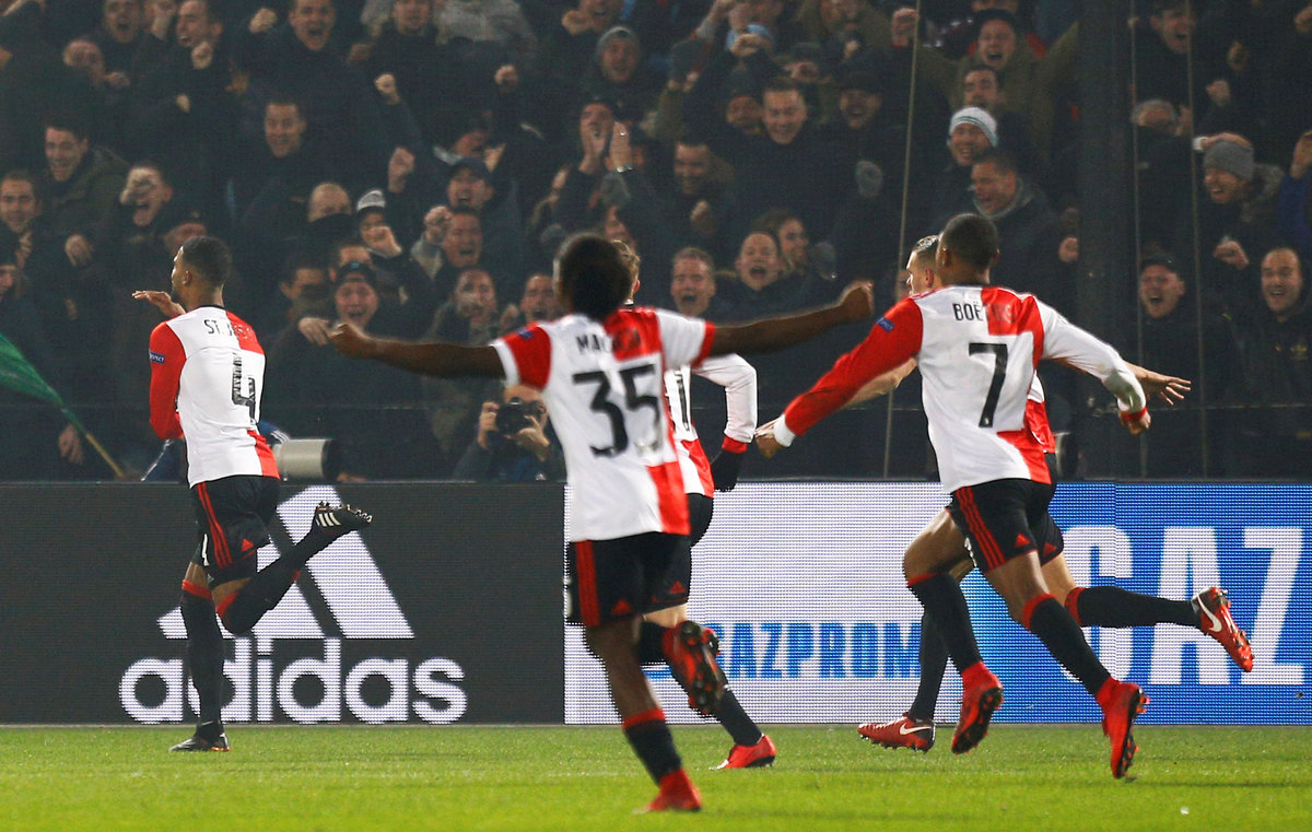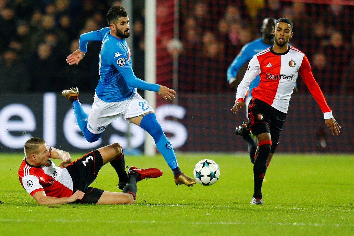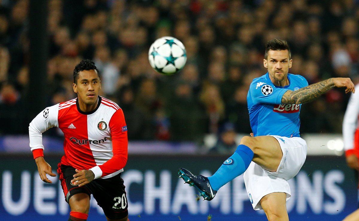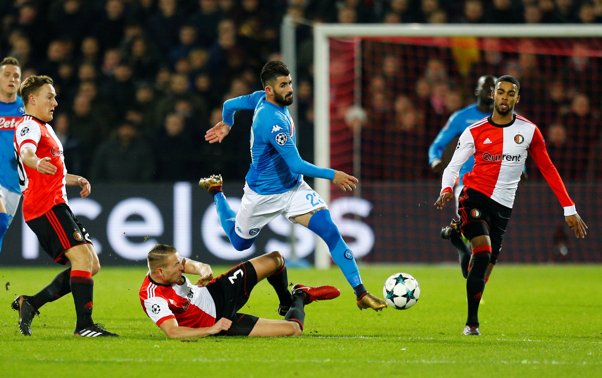 Soccer Football - Champions League - Feyenoord vs Napoli - De Kuip, Rotterdam, Netherlands - December 6, 2017 Napoli's Elseid Hysaj in action with Feyenoord's Sven van Beek and Feyenoord's Jeremiah St. Juste REUTERS/Michael KoorenSoccer Football - Champions League - Feyenoord vs Napoli - De Kuip, Rotterdam, Netherlands - December 6, 2017 Feyenoord's Renato Tapia in action with Napoli's Marek Hamsik REUTERS/Michael KoorenSoccer Football - Champions League - Feyenoord vs Napoli - De Kuip, Rotterdam, Netherlands - December 6, 2017 Napoli's Dries Mertens in action with Feyenoord's Sven van Beek and Feyenoord's Renato Tapia REUTERS/Michael KoorenSoccer Football - Champions League - Feyenoord vs Napoli - De Kuip, Rotterdam, Netherlands - December 6, 2017 Feyenoord's Jeremiah St. Juste celebrates scoring their second goal REUTERS/Michael KoorenSoccer Football - Champions League - Feyenoord vs Napoli - De Kuip, Rotterdam, Netherlands - December 6, 2017 Feyenoord's Jeremiah St. Juste celebrates scoring their second goal REUTERS/Michael KoorenSoccer Football - Champions League - Feyenoord vs Napoli - De Kuip, Rotterdam, Netherlands - December 6, 2017 Feyenoord fans REUTERS/Michael Kooren TPX IMAGES OF THE DAY