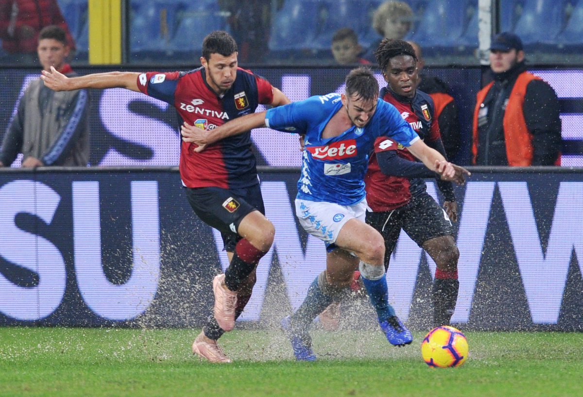 Christian Kouame gave Genoa a halftime lead but, after play was halted for around 10 minutes early in the second half until the rain stopped, Fabian Ruiz levelled and Genoa's Davide Biraschi put through his own net.