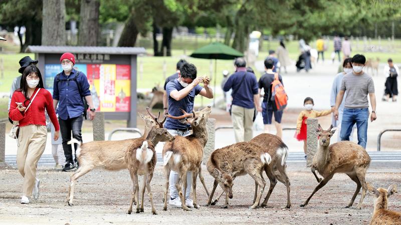 The park's visitor numbers have decreased due to the spread of novel coronavirus infections, so the deer no longer receive food such as so-called shika senbei, a rice cracker sold to tourists to give to the animals. The number of deer in the grassy, wooded park is 30 to 40 percent less than it was before the outbreak.